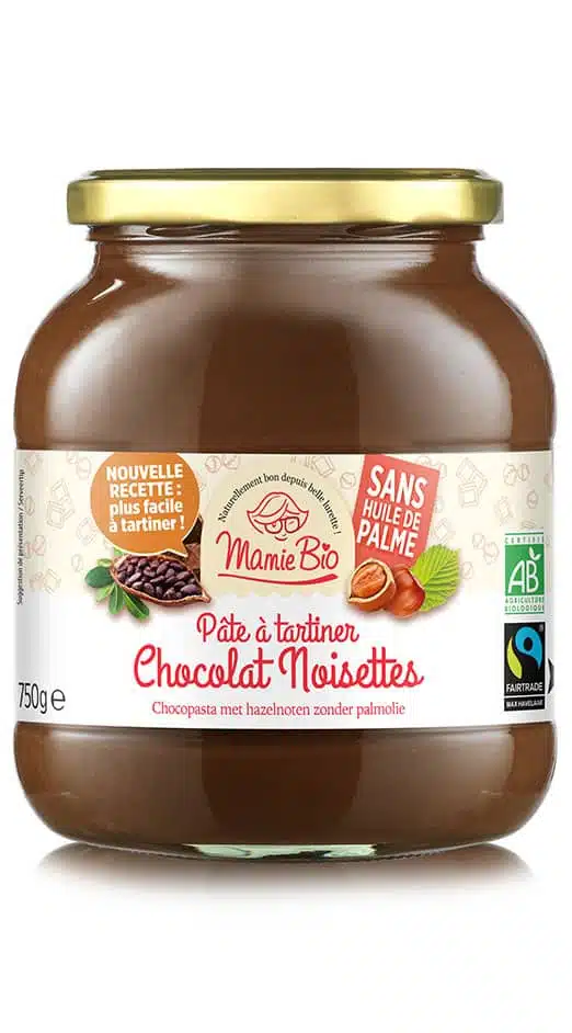 Accueil > Produits > Mamie Bio l'épicerie gourmande > Épicerie sucrée > Les pâtes à tartiner > Pâte à tartiner chocolat noisettes équitable bio – 750g